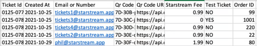 You can download a list of event attendees who have bought tickets via Starstream in CSV format. The downloaded sheet also includes those attendees added manually. When you download the list, it will have the following details for every attendee/ticket: